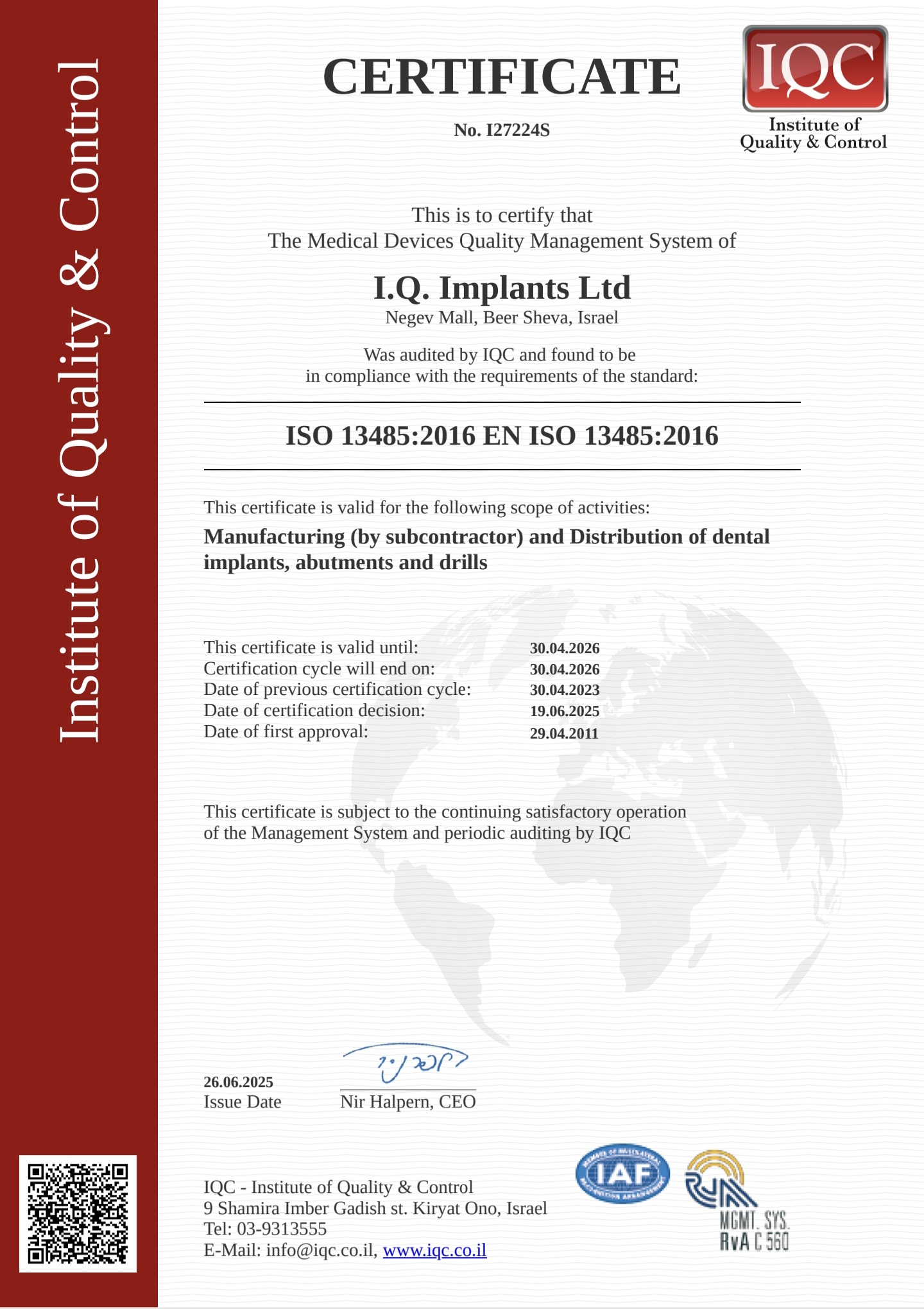 Сертификаты IQ Implants