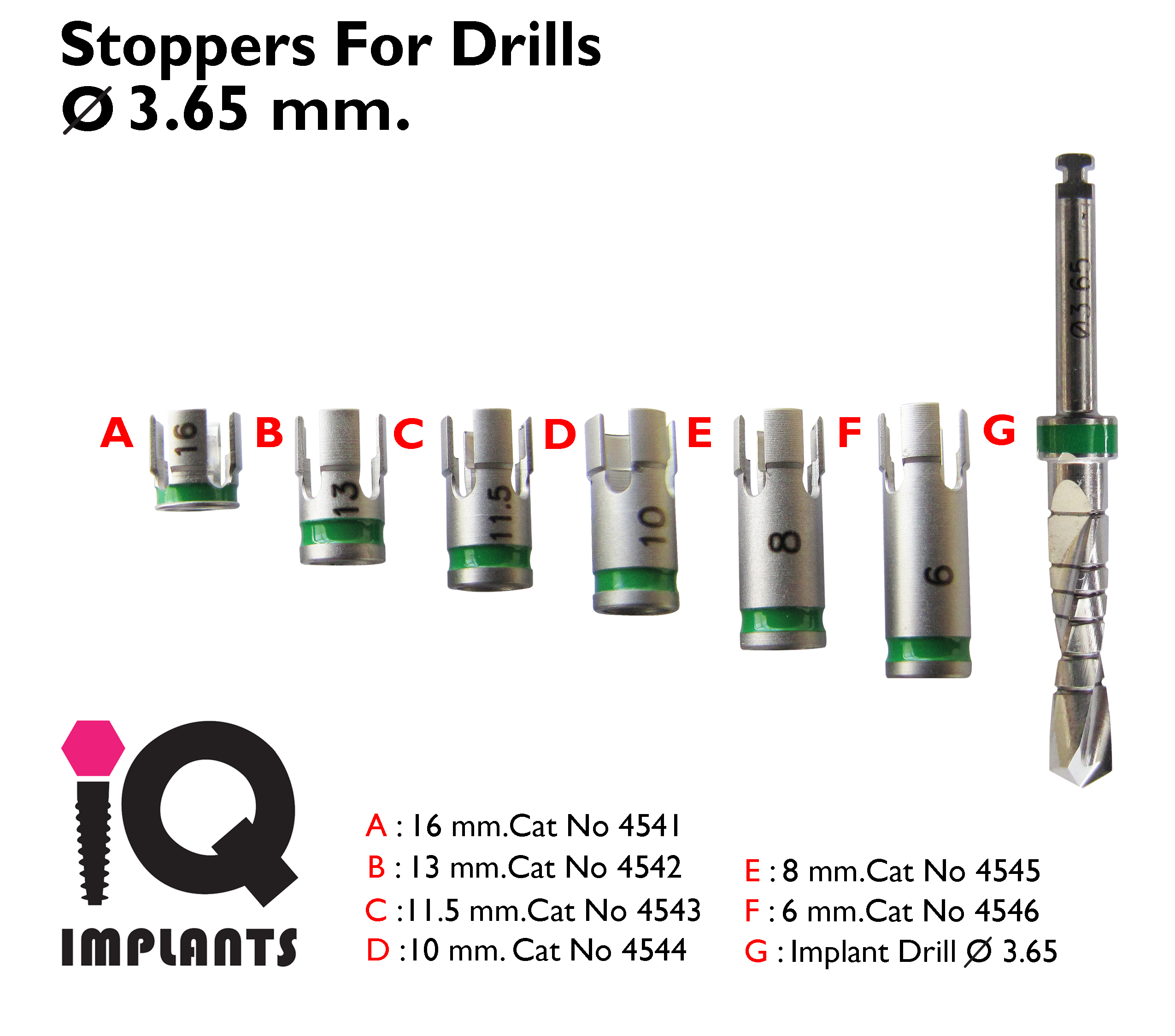 Set Of 6 Drill Stoppers and Implant Drill Externally Irrigated 3.65 mm